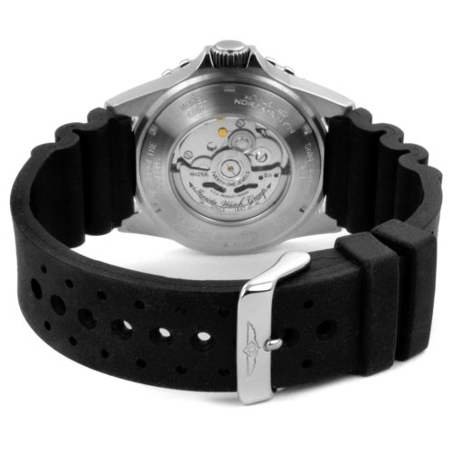 - Black Dial with Silver Tone Hands and Hour Markers; Black Unidirectional Bezel; Luminous; Magnified Date Window on Crystal; Skeleton Case Back