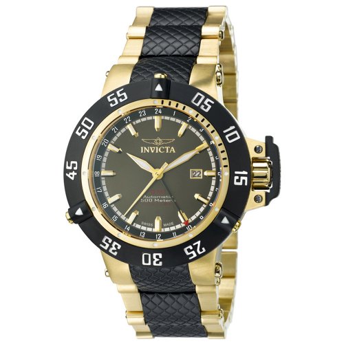 Telling time has never been easier than on the clean, sophisticated face of this Subaqua Noma III Collection GMT automatic men's watch by Invicta. A 58-millimeter case constructed of 23-karat-yellow-gold-plated stainless steel, and a stainless steel bezel support the watch's black dial, which features gold-tone hour indexes and matching watch hands, along with small Arabic numerals that count out the 24-hour clock and a slim red-tipped hand to track it. A date calendar rests at the three o'clock position, while the dial face is protected by a scratch-resistant sapphire window. Raised Arabic numerals mark the unidirectional black bezel in five-minute increments on this automatic-movement-powered watch, which is also resistant to 1640 feet. A 23-karat-yellow-gold-plated stainless steel textured band holds the watch securely to your wrist with a fold-over clasp with safety mechanism.