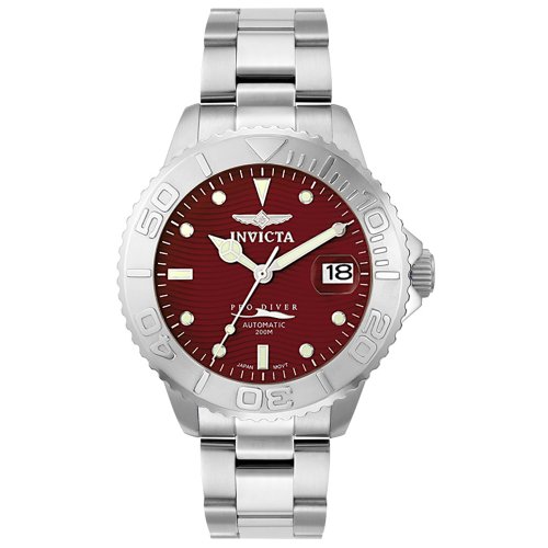 Big, bold and masculine, the Invicta Pro Diver Automatic 6017 is an affordable luxury watch with classically styled features. This precisely constructed timepiece for men features a solid stainless steel case that's 43mm wide (1.69 inches). It has a textured red face with Tritnite luminous hands and markers, allowing them to glow for up to 20 hours in the dark. This watch also has a solid stainless steel unidirectional rotating bezel with raised numerals and markings and coin-edge detailing. In addition, this watch features a see-through exhibition back window, allowing you to view the movable parts in motion. Other features include anti-reflective mineral crystal, magnified date display at 3 o'clock, and water resistance to 660 feet (200 meters). The highly polished stainless steel band has a fold over clasp with safety.